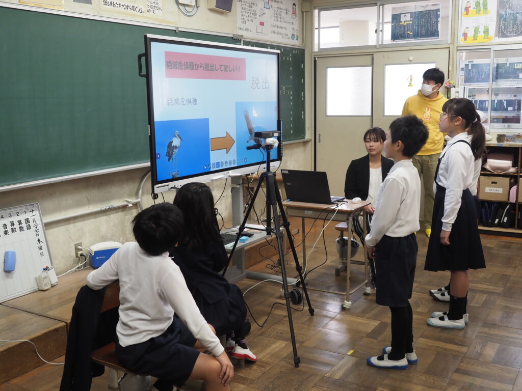 当基金の支援を受け、コウノトリをテーマとした環境学習を行っている鳴門市堀江北小学校と、同じくコウノトリについて環境学習を行っている栃木県小山市の下生井小学校との、コウノトリや地域の自然について学習したことの発表をし合うオンライン交流授業が、R4年度から続き、今年度も開催されました(令和7年11月26日開催)!