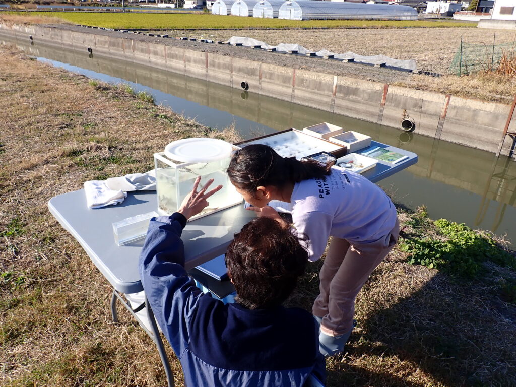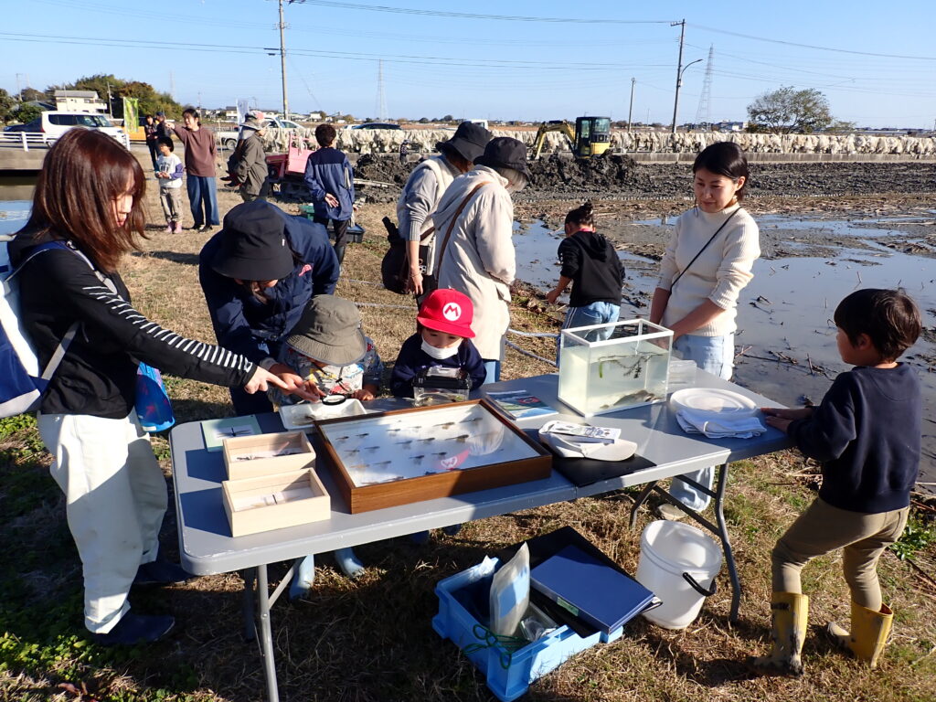 また、掘りとり後は、コウノトリのエサとなる、様々な生きもの(ヤゴ、ゲンゴロウ、エビ、ドジョウ、フナ、タナゴ等)も観察してもらいました!