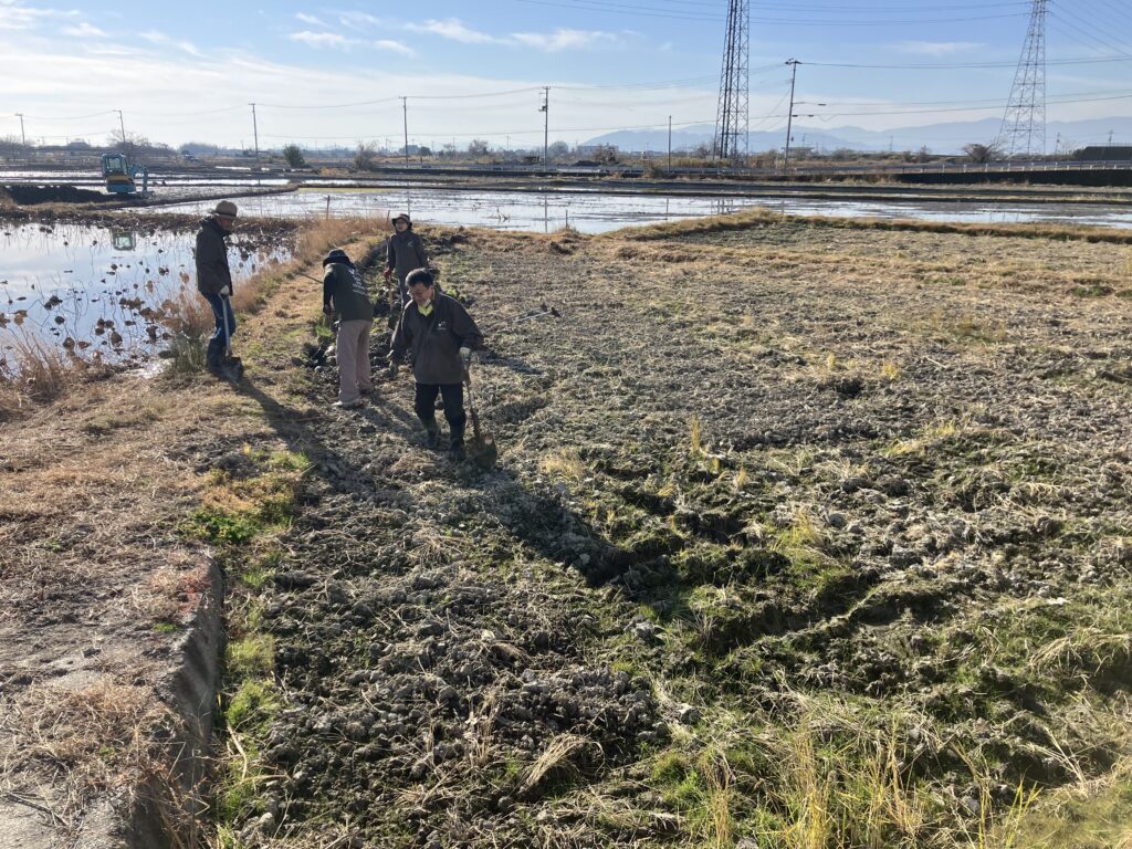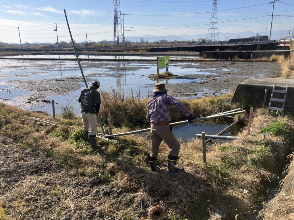 その前に、ビオトープの深みの囲いを修理したり、古くなった畦シートを外す作業をしました。